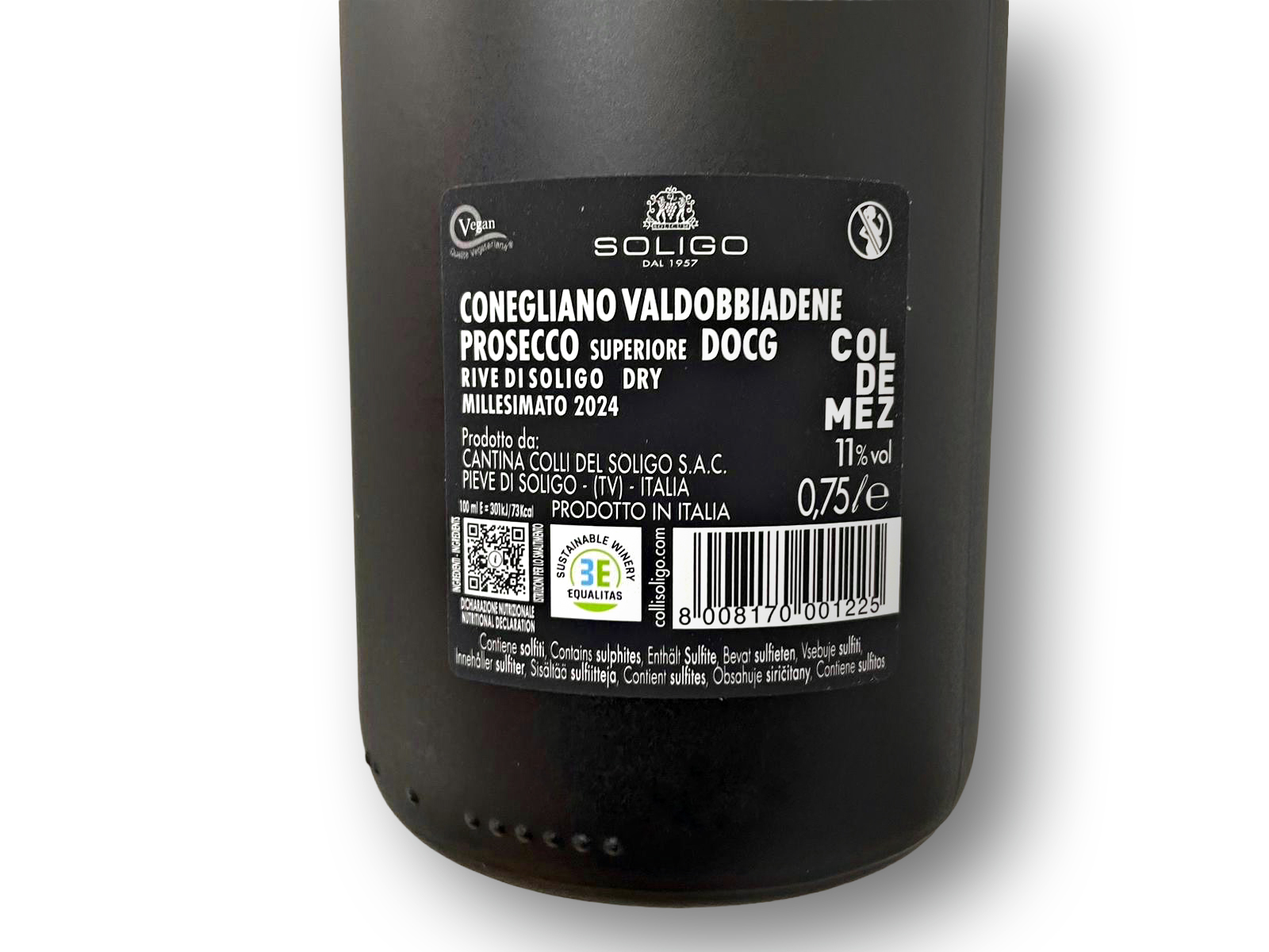 Facciamo un esempio pratico. Ecco l’etichetta del Conegliano Valdobbiadene Prosecco Superiore DOCG firmato Colli del Soligo. Riporta tutte le informazioni utili per conoscere il vino: la denominazione di origine, la provenienza, la tipologia “Dry” e l’indicazione “Millesimato 2024”, che segnala l’annata di riferimento.