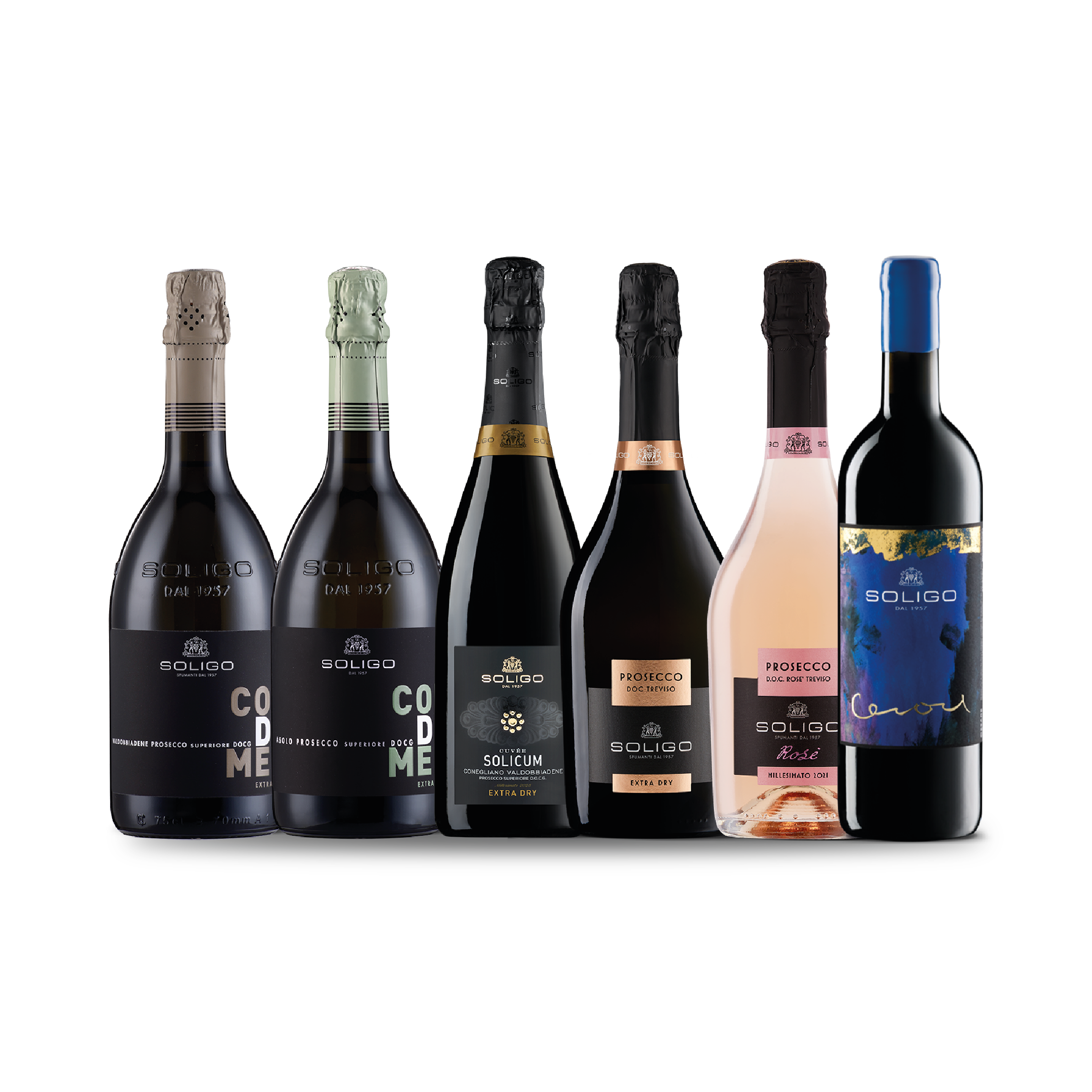 Il Set Invernale riunisce sei etichette Soligo in un viaggio attraverso le mille sfumature del territorio del Prosecco: dai profili più morbidi e fruttati a quelli più secchi e raffinati, fino alla finezza di un Rosé Millesimato e al carattere avvolgente di un rosso vellutato.